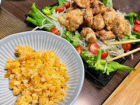 手前の自分でつくったキムタクチャーハンもうまかったけど、奥のプラントで買った唐揚げもうまかった。なんか賞をもらったって書いてあった。