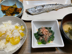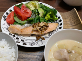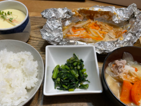 鮭のちゃんちゃん焼き、茶碗蒸し、春菊のおひたし、豚汁。カンペキだ。