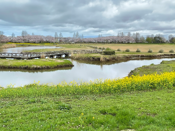 仕事のついでにちょっと上堰潟公園に寄ってきた。休日だと駐車場に入れないしね。桜もちょうど満開。天気がよければなー。