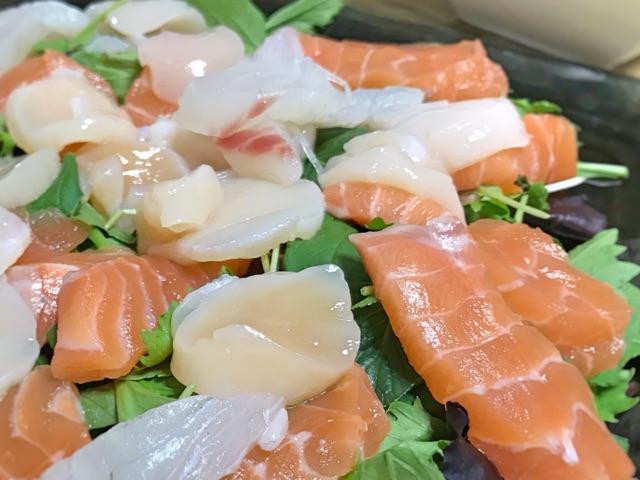 昨日の夕ご飯。最近、土曜日はお寿司も含めて刺身の日としております。今回はカルパッチョ。酒が進むぜ。