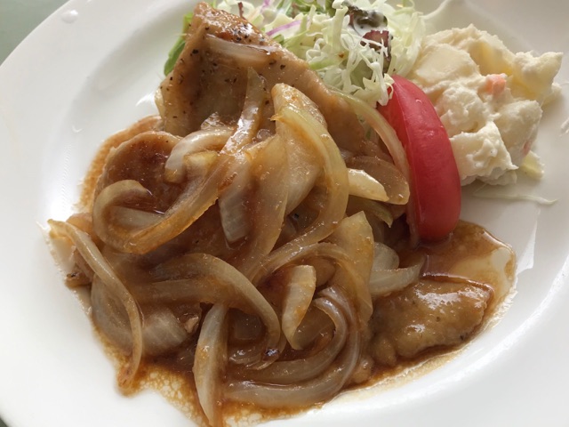 生姜焼き定食なんだけど、タマネギもいっぱい。タレにとろみがあるのはどうやってるんだろ。