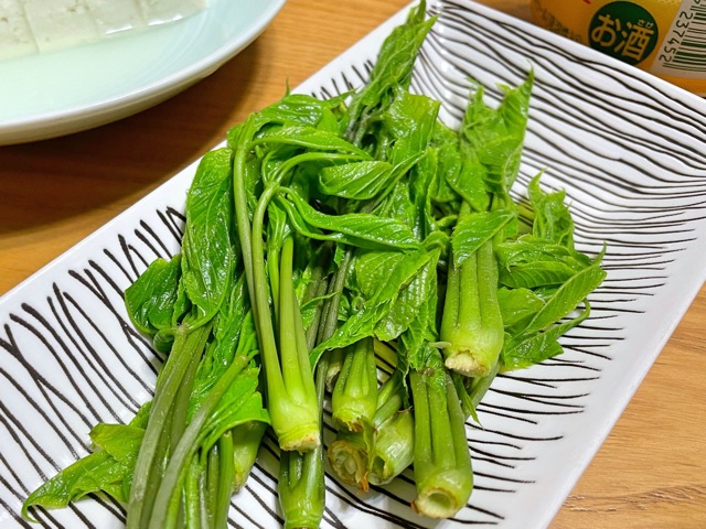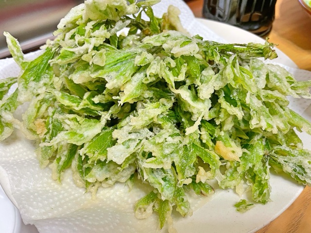 コシアブラ2パックも買っちゃったら、天ぷらが山になってしもた。半パックくらいを試しにおひたしにしてみたら、山の香りでしたよ。うめーなー。