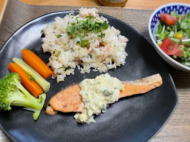 鮭のムニエルとガーリックバターライス。タルタルソースはらっきょで作ったぜ。