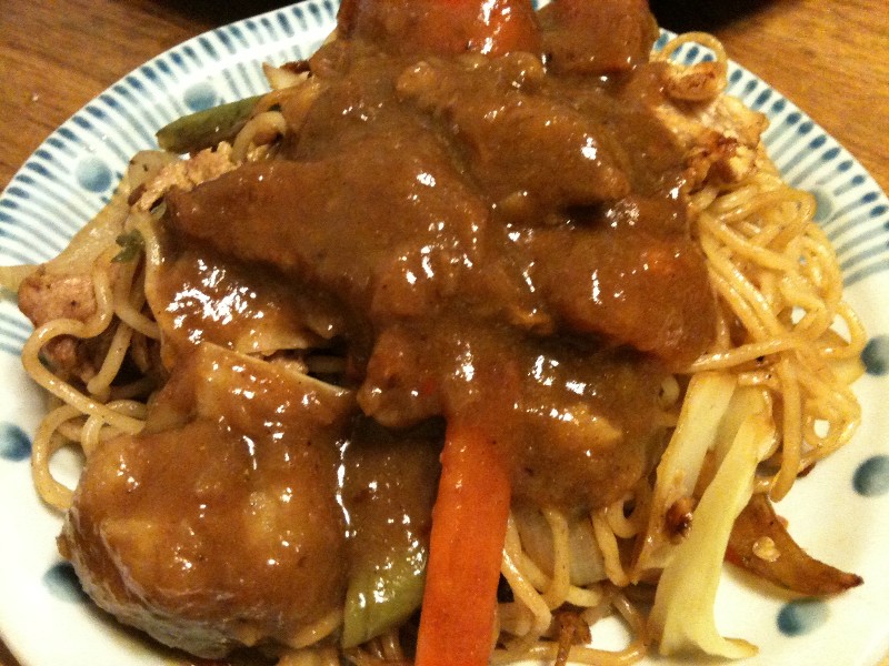硬めにちょっと焦がした焼きそばにかけました。まんぞく!