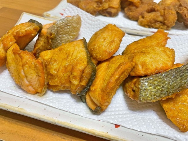 そろそろ揚げ油を捨てようかと思ったのでカレー粉まぶして。余ったので、ついでに鶏肉も。