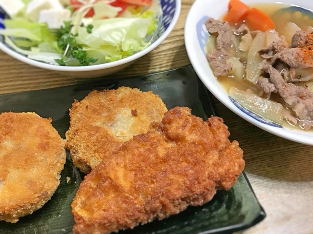 肉じゃがついでにコロッケも作ってみた。なかなかである。 手前の長いのはあまった衣だけ揚げたやつ。中身スカスカ。