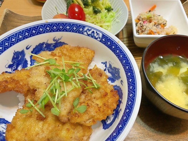 タレカツ丼。生姜焼きくらいの薄めの肉がいいやね。 さすがにもう腹いっぱい。