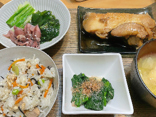 昨日の夕ご飯。ひじきなどを煮てご飯に混ぜた。カレイは買ったやつな。ほぼタマゴ。