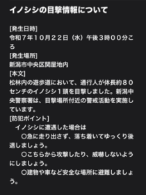 投稿日: 2025年10月22日2025年10月22日 投稿者: はちごろうおいおい まだそこにいたんか。小針浜方面で死んでるのを見たという情報があったんだけど、別の個体なのか。 山はクマ、海沿いはイノシシ。外歩けませんな。 そういえばこの前、猿の群れ見たな。どこだっけ。