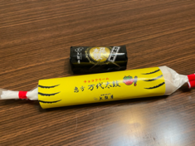 本日発売の恵方万代太鼓。ノーマル万代太鼓の2倍の長さ、中はチョコクリーム。