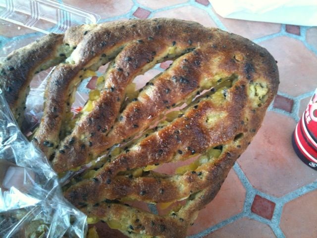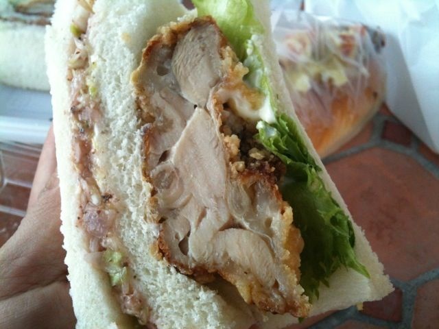 栗がいっぱい入った葉っぱの形のパンと、チキンに梅ソースのサンド。