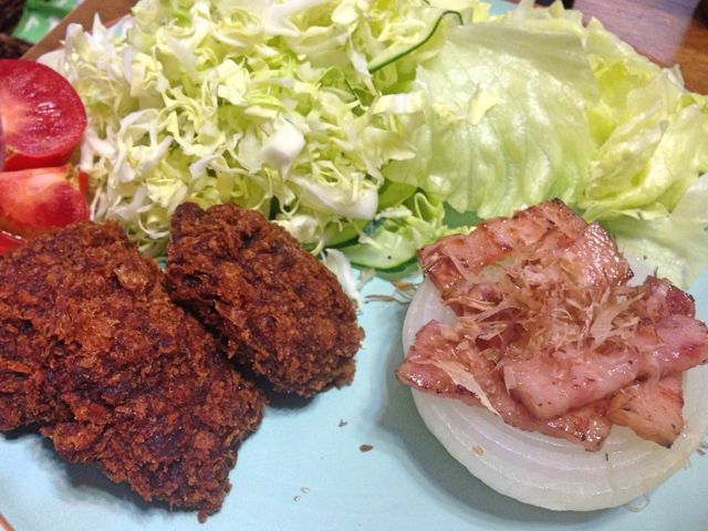 投稿日: 2014年6月4日2014年6月5日 投稿者: はちごろうたまねぎベーコンうまっ 半年ほど前に何回か作った、たまねぎベーコンいってみよー。中心にニンニク入れてチン。あとでバターとベーコンをトッピング。 左の味噌カツは冷凍です。