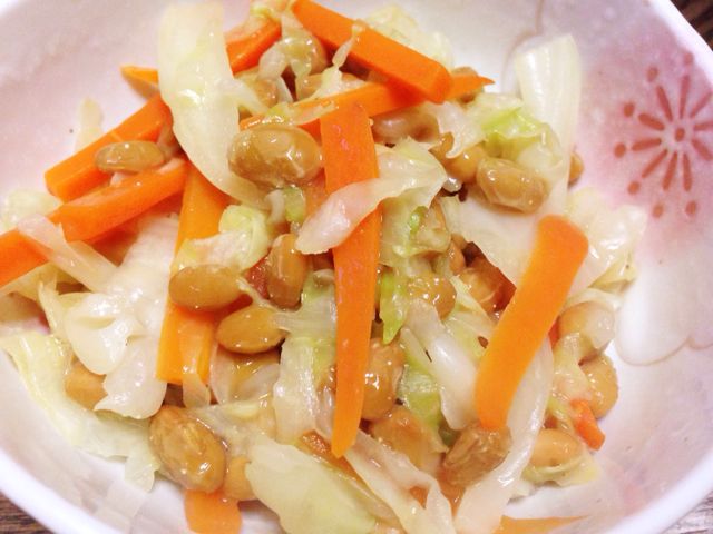 メインは魚の干物だったんですが、野菜を摂らなきゃね。ニンジンとキャベツをさっと茹でて、納豆入れただけ。簡単でいいよ。